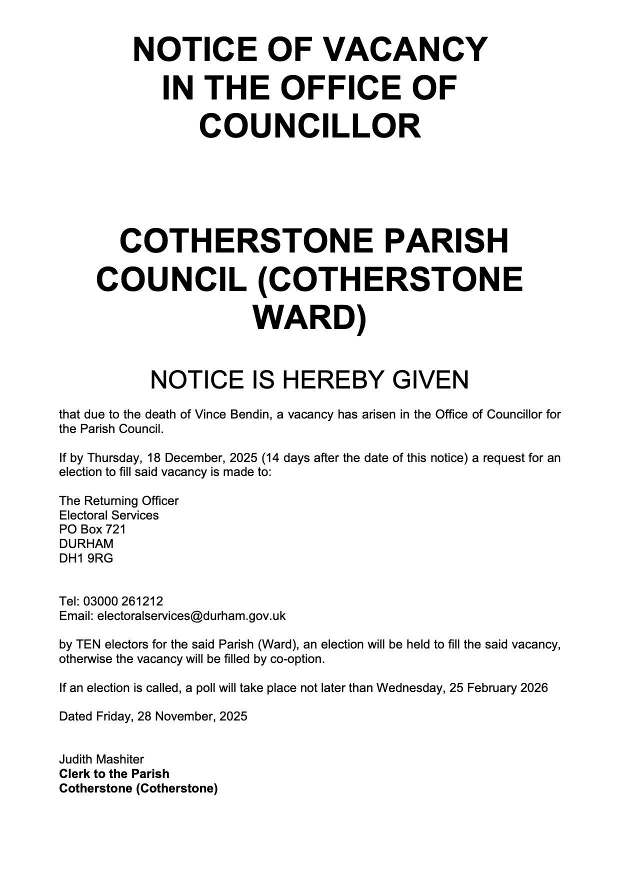 There is currently one vacancy on Cotherstone Parish Council.